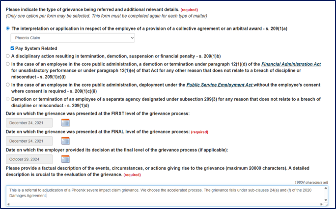 - A severe impacts claim must have been filed for severe impacts and other demonstrable cases under one of the damages agreements for a grievor to use the accelerated adjudication processes
