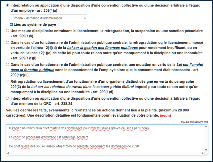 - Vous devez indiquer sur le formulaire « renvoi d’un grief relatif à des dommages pour répercussions graves causés par Phénix »